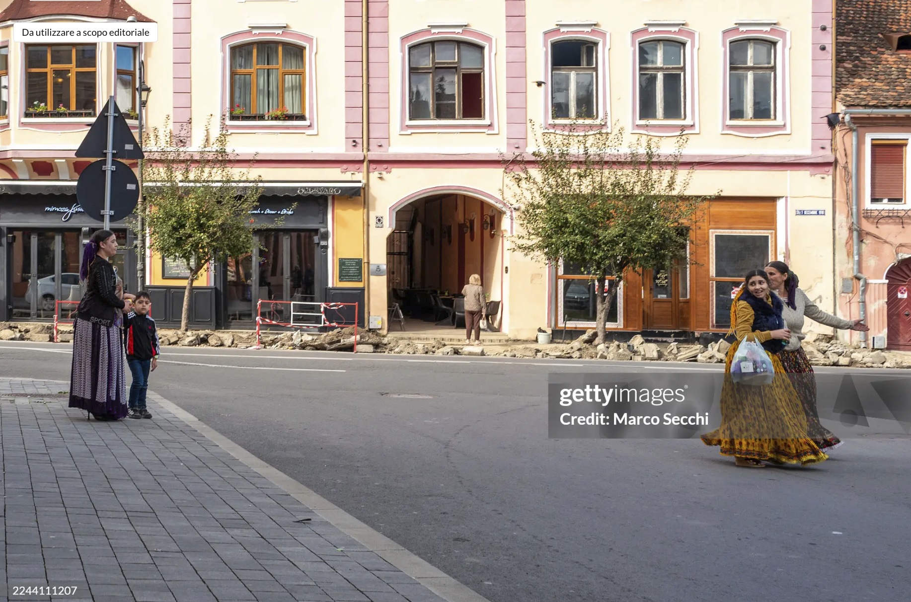 Three Roma women cross the road in fortified citadel, Sighișoara, Transylvania, Romania.